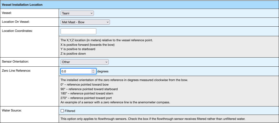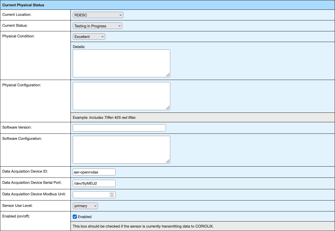 Logging data to CORIOLIX first requires the creation of a sensor record in the CORIOLIX database. Because CORIOLIX manages all phases of the data lifecycle, and not simply logging, it requires us to specify a diverse and comprehensive set of metadata up front. While all metadata fields are not strictly required, best practice is to maintain all fields.