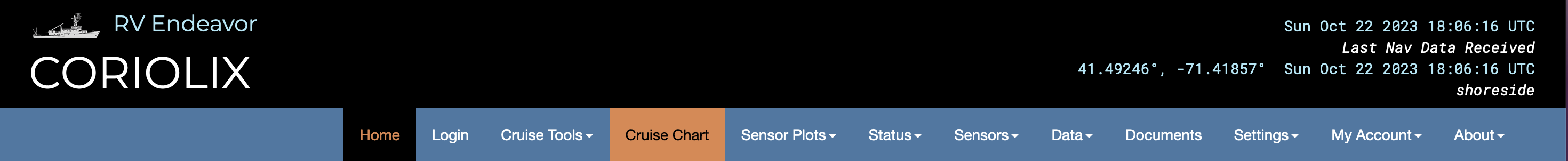 The cruise charts page ("Cruise Charts" from the CORIOLIX navigation menu) is a web mapping interface for CORIOLIX. It presents a dynamic map view of the vessel, its realtime data, and supporting geospatial information such as nearby research infrastructure, routes, and waypoints. The cruise chart page also has built-in integrations with the Cruise Event Log and Route Planning tools.