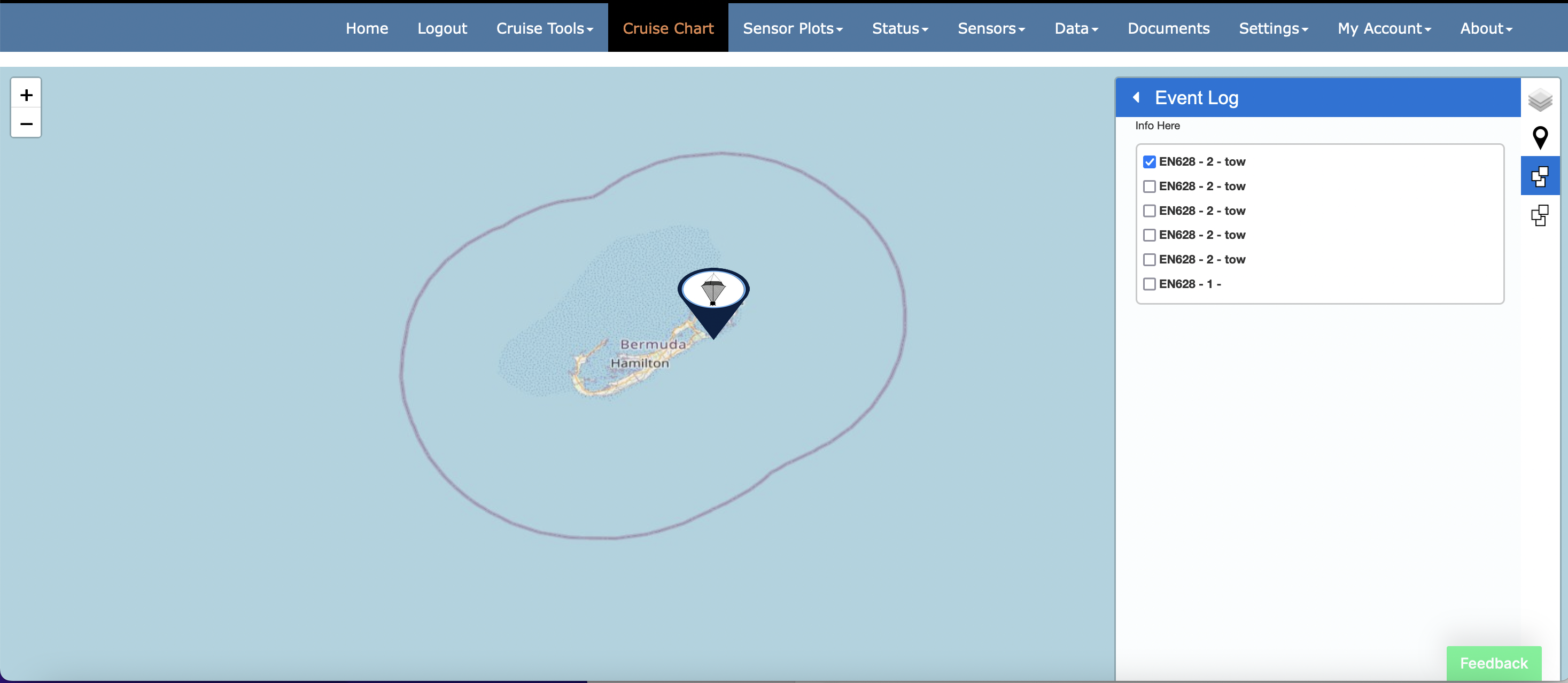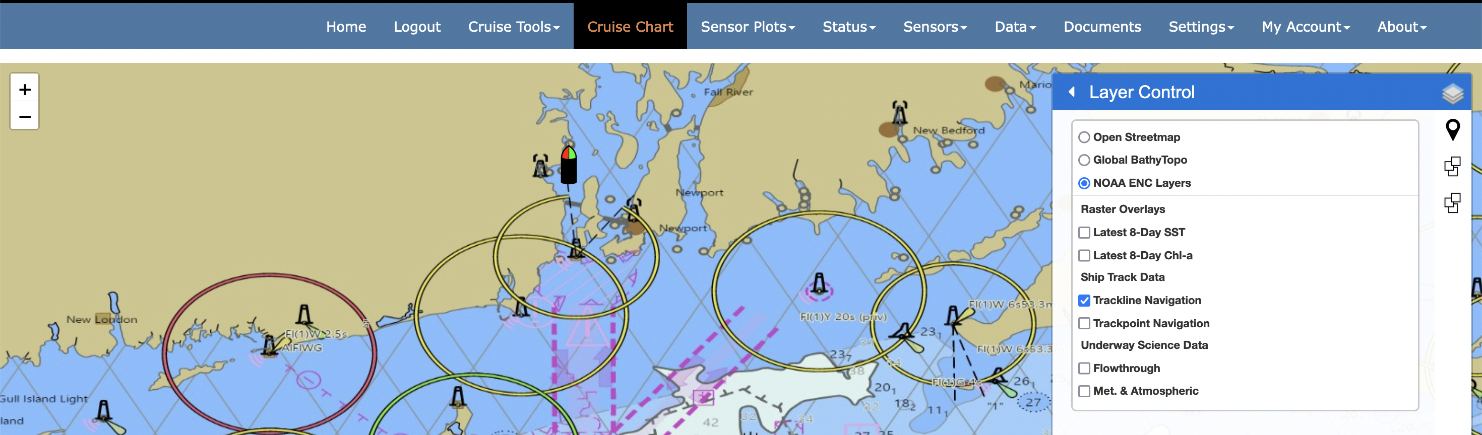 All cruise events are available for visualization in the charting interface. The Events control, immediately below the Custom Routing control, provides the user a mechanism to toggle event visibility. Place a check next to any event that you would like to make visible in the map view.
