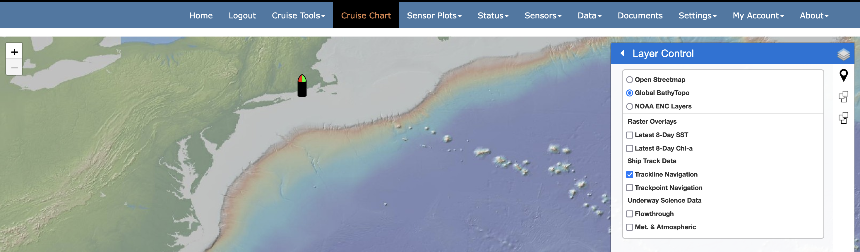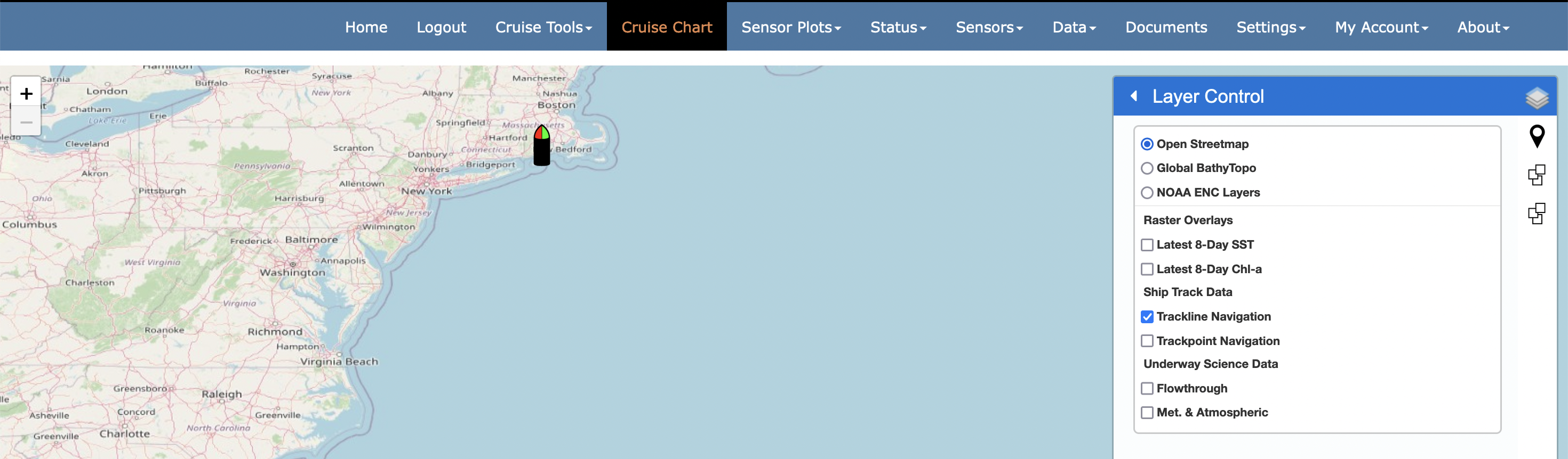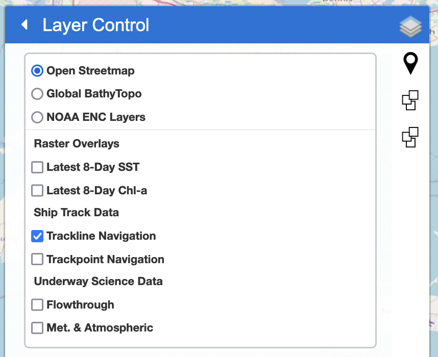 This grouping presents the ship navigation in trackpoint (navigation fixes) or trackline (navigation path) format. Note that trackpoints are clickable and will open a pop-up with Heading, COG, and SOG data relevant to the trackpoint of interest.