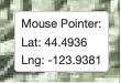 Located in the lower righthand corner of the map pane. Provides coordinate readout (decimal degrees) for mouse pointer location.