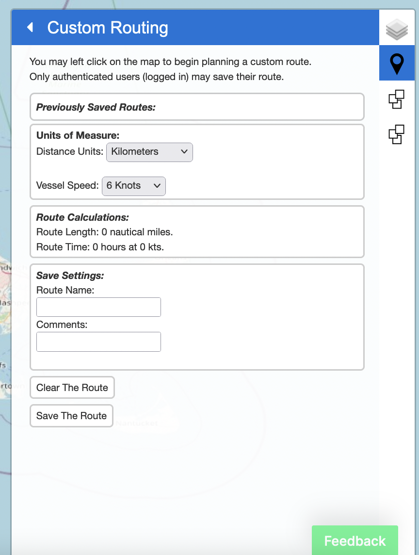Located just below the Layer Control in the Menu Bar, the Custom Routing controls provide a user interface for creating new routes (routes are defined here as simple line or polyline shapes stored as geoJSON in the CORIOLIX database).