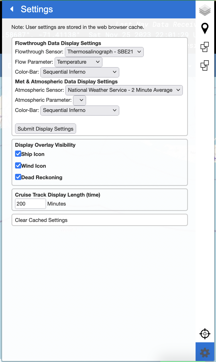 The first group of settings control how the Underway Science Data trackpoints will be rendered. Use the dropdown menus to select an instrument and color scheme. When available, we use the local range for the parameter of interest to set the color bounds. If the local range is not available, we use the global range. If no global range is available then the user will need to manually set the color minimum and maximum.