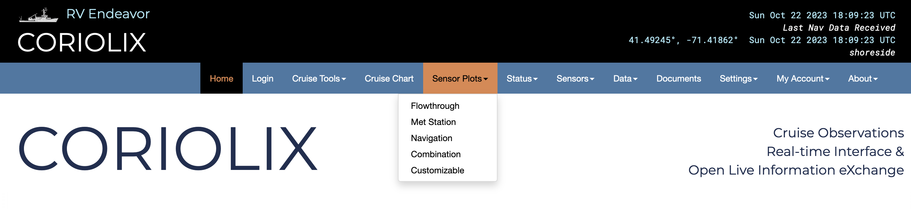 The sensor plots pages are system specific (Flowthrough & Meteorological) groupings of 2-D instrument real-time displays. The sensor plots pages provide an integrated (overlay) display of all sensors belonging to a system for quick and easy visual comparison. We also include a data access interface on each sensor plots page. A customizable plots page is included for user difined sensor plotting.
