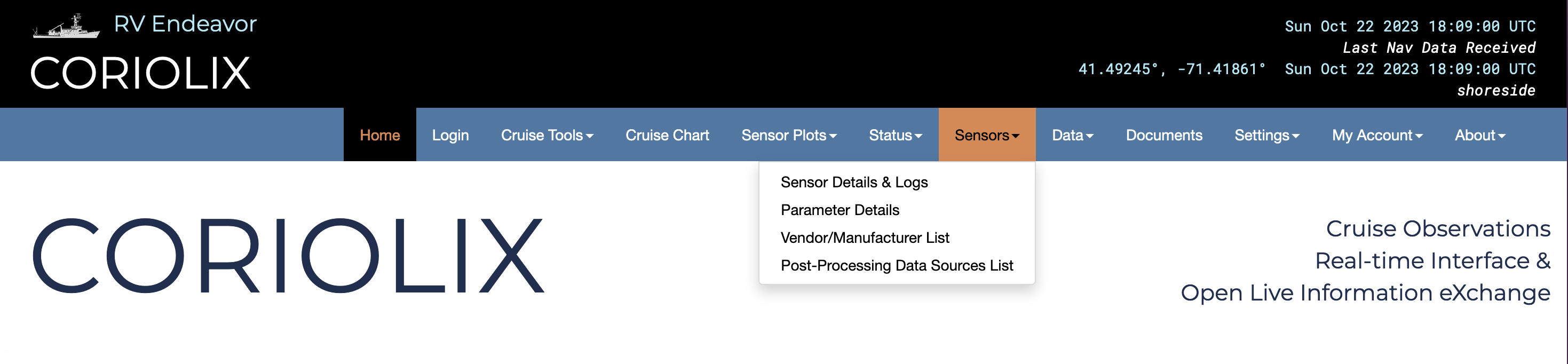 This page presents a tabular list of all scientific sensor equipment known to the system. Grey shaded rows indicate that the sensor is currently disabled, white rows indicate that the sensor is currently enabled. Rows may be sorted (forward or reverse) alphabetically by one of multiple fields using the arrow symbols that surround field names. Anonymous users will see options to view metadata and realtime plots as well as acess the data. Authenticated users with elevated permissions will be granted additional options including methods to modify or create new metadata.